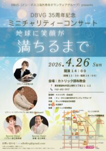 『地球に笑顔が満ちるまで』DBVGの活動35周年を記念して、カトリック調布教会にてチャリティコンサートを開催いたします。世界を舞台に活躍する石原慎之助さんのマリンバ、野口明生さんのイーリアンパイプス、そしてスペシャルゲス […]