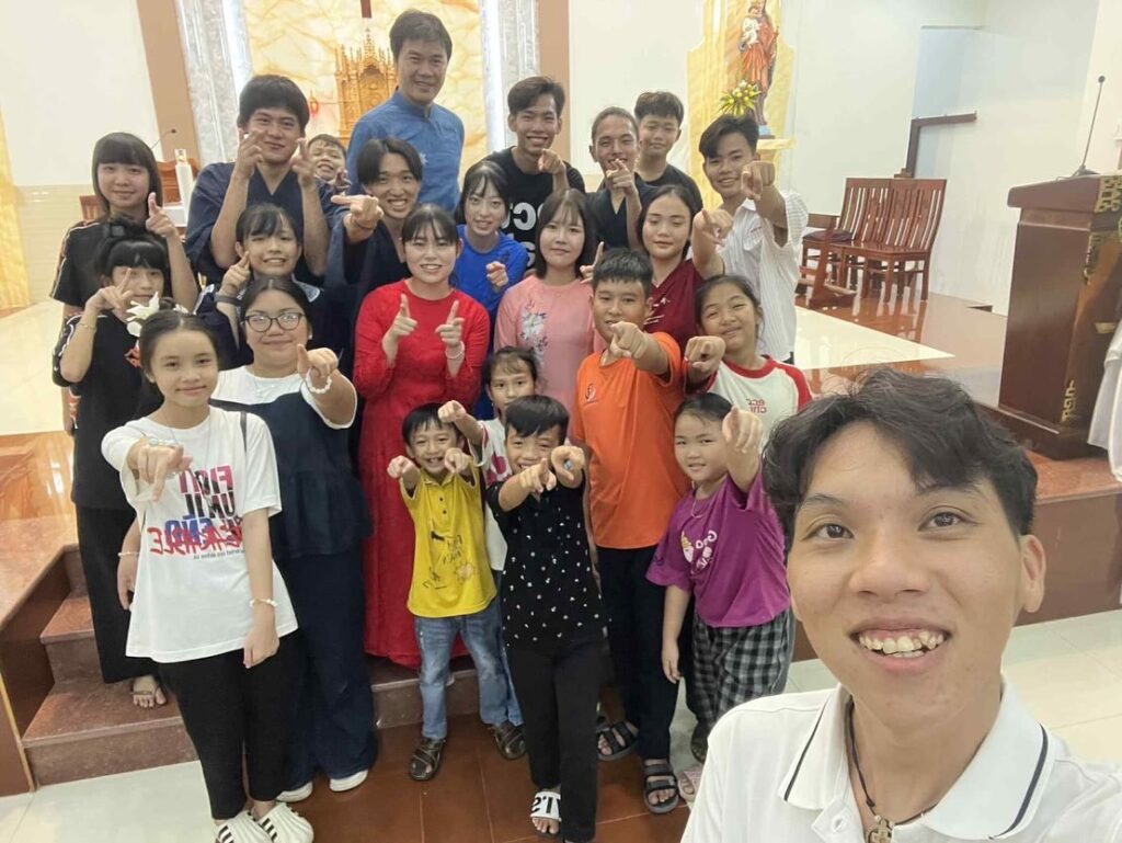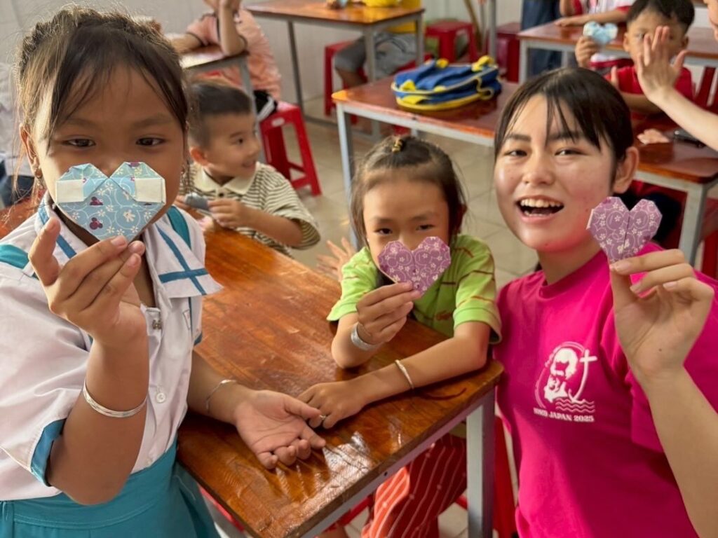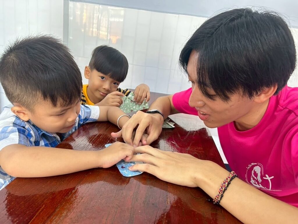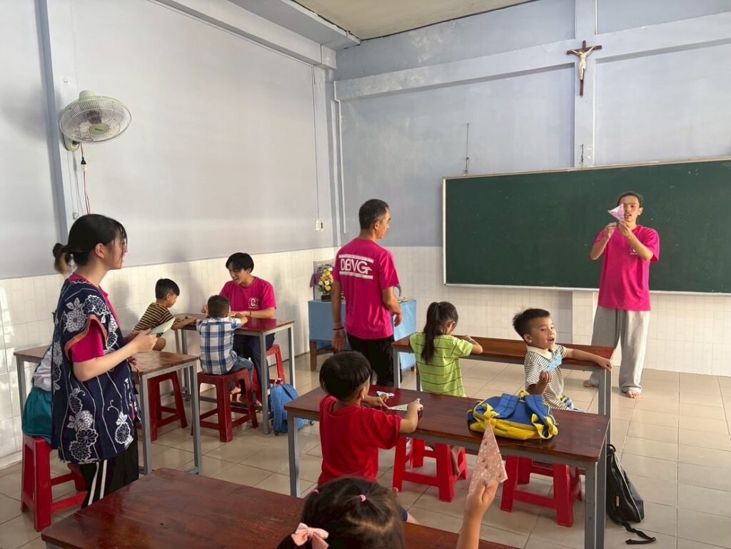 【205年9月5日(金)】 本日は、午前中に小学校で授業を行いました。挨拶などの簡単な日本語を教えたり、折り紙を折ったり、作った紙飛行機を飛ばしたりして遊びました。午後は、報告会に向けての話し合いや歌、ダンスの練習を行い、夕方18時から浴衣やアオザイを着て教会のミサに与りました。その後、神父様方や信者さんたち、教会関係の方々とお別れパーティーを行いました。 #dbvg#サレジオ会#ボランティア#ドンボスコ#ベトナム#タックバン Share: Twitter Facebook Google+